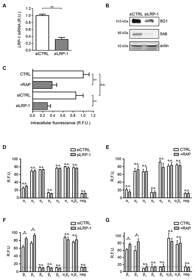 Figure 1: Cell surface β1-integrin accumulates under LRP-1 inhibition or silencing. (A) Total RNAs were purified from FTC-133 cells transfected with non-silencing siRNA (siCTRL) or siRNA targeting LRP1 (siLRP-1). LRP1 mRNA expression was quantified using real-time RT-PCR and expressed as relative units (R.U.). RPL32 and RS18 were used for normalization. siCTRL cells served as a reference set to 1. (B) LRP-1 protein expression from FTC-133 cells transfected with non-silencing siRNA (siCTRL) or siRNA targeting LRP1 (siLRP-1) was assessed by SDS-PAGE immunoblotting of LRP-1 α chain (8G1) and LRP-1 β chain (5A6). (C) Wild-type FTC-133 cells (WT) were treated in presence or absence of 500 nM RAP or transfected with siRNA sequences (siCTRL and siLRP-1), and then incubated for 30 min in serum-free medium containing FITC-labeled human α2-macroglobulin. The intracellular fluorescence reflecting endocytosis activity was determined as described elsewhere [20] and is expressed as relative fluorescence units (R.F.U.), by comparison with signal from untreated WT cells (CTRL). (D-G) α- and β-integrin subunits were quantified at FTC-133 cell surface using an antibody array under LRP1 silencing (siLRP-1) (D and F) or 500 nM RAP treatment (E and G). The specific signal threshold was established using negative controls (neg) and is represented by dotted lines. Each value is the mean ± SD for at least three independent experiments, each performed in triplicate. n.s., not significant; *, P < 0.05; **, P < 0.01; as compared to the corresponding CTRL or siCTRL condition (white bars).