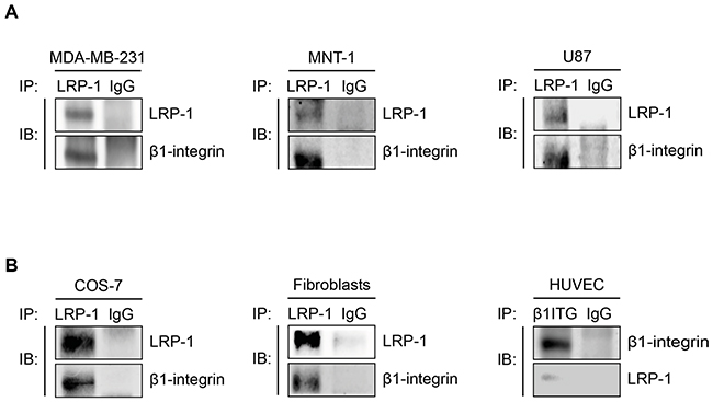 Figure 3: The LRP-1/β1-integrin complex is not only established in thyroid carcinoma. Whole-cell extracts were isolated from breast tumor cells (A, left panel), melanoma cells (A, middle panel), glioblastoma cells (A, right panel), COS-7 cells (B, left panel), primary dermal fibroblast (B, middle panel) or endothelial cells (B, right panel). Immunoprecipitation of LRP-1 was conducted and immunocomplexes were immunoblotted using anti-LRP-1 and anti-β1-integrin antibodies as described above. Considering the low level of LRP-1 expression in HUVECs, immunoprecipitations of β1-integrin was favored. Nonspecific IgGs were used as a negative control for each assay.
