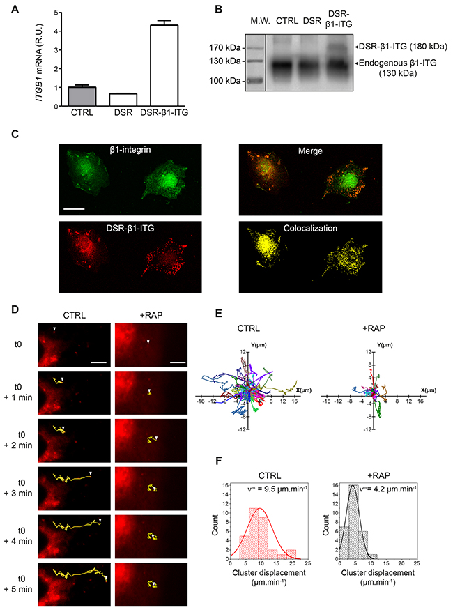 Figure 5: The intracellular trafficking of β1-integrin clusters is under LRP-1 control. (A) Total RNAs were purified from FTC-133 cells transfected with either a DSR2-control plasmid (DSR) or the DsRed2-β1-integrin encoding plasmid (DSR-β1-ITG). ITGB1 mRNA expression was quantified using real-time RT-PCR and expressed as relative units (R.U.). RPL32 and RS18 were used for normalization. Non-transfected cells (CTRL) served as a reference set to 1. (B) Recombinant DsRed2-β1-integrin (DSR-β1-ITG) expression was assessed by SDS-PAGE immunoblotting using anti-β1-integrin (M-106) antibodies. While endogenous β1-integrin migrates around 130 kDa (CTRL and DSR), an expected shift to 180 kDa was observed for the DSR-β1-ITG recombinant product (DSR-β1-ITG). Protein ladder was indicated on the left of the SDS-PAGE. (C) FTC-133 cells were seeded onto 1% gelatin-coated coverslides and then allowed to grow for 24 h before being transfected with DsRed2-β1-integrin plasmid (DSR-β1-ITG, red). After 24 h, cells were labeled with Alexa fluor 488 for endogenous β1-integrin (green). Merged image and colocalization signal were presented in right panels. Bar: 10 μm. (D) FTC-133 cells were seeded onto 1% gelatin coated labtek-I and then transfected with DsRed2-β1-integrin plasmid (DSR-β1-ITG). Cells were maintained under control conditions (CTRL) or treated with 500 nM RAP (+RAP) while video microscopy images were taken every 4 s over 5 min. Trajectories for one representative DSR-β1-ITG cluster in both conditions are represented in yellow. White arrowhead represents the position of DSR-β1-ITG cluster from t=0 (i.e. 10 min after RAP addition) to t=5 min. Bars: 5 μm. (E) Trajectories of DsRed2-β1-integrin clusters obtained under control conditions (CTRL) or 500 nM RAP treatment (+RAP) are represented through XY axes (n=28 and n=29, respectively; 4 independent experiments). (F) Diagrams represent the repartition of DsRed2-β1-integrin clusters displacement speed under control (CTRL) or 500 nM RAP treatment (+RAP) conditions. vm represents the average speed of DSR-β1-ITG clusters in each condition. Overlay curve is the normalized Gaussian curve deduced from our results.