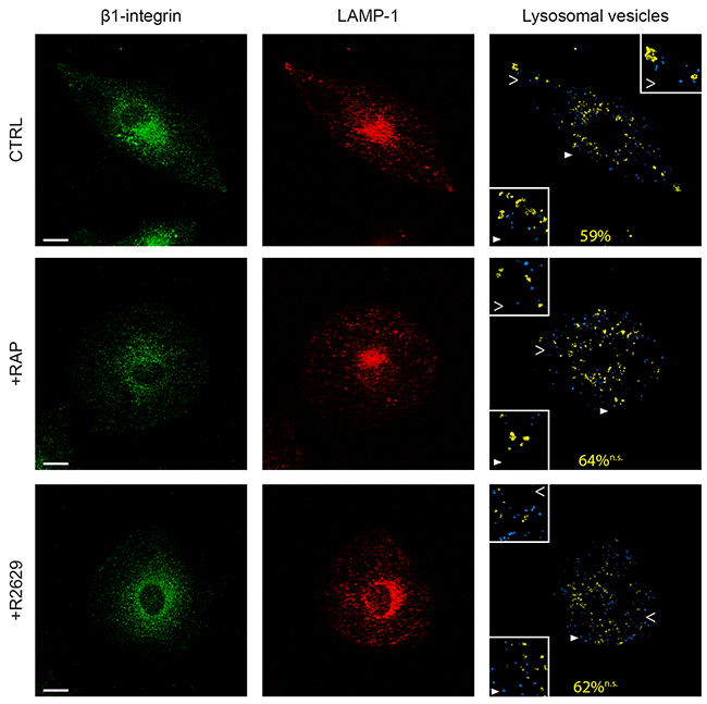 Figure 7: LRP-1 does not address β1-integrin to lysosomes. FTC-133 cells were plated onto 1% gelatin coated coverslides and then maintained during 1 h under control conditions (CTRL), 500 nM RAP (+RAP) or 2.5 μg.mL-1 R2629 antibody (+R2629) treatment. β1-integrin staining with Alexa Fluor 488 (left panel) and infection with lysotracker for LAMP-1 (middle panel) were carried out before confocal microscopy analysis. On the right panel, lysosomes containing no β1-integrin are represented in blue and β1-integrin-containing lysosomes are represented in yellow. The average percentage of lysosomes positive for β1-integrin is indicated in yellow. Statistical analysis was conducted on lysosomal vesicles from 60 to 200 voxels (n.s., not significant; as compared to CTRL). Cell areas indicated by full and empty white arrowheads highlighting representative lysosomes for each condition are proposed as 2-fold enlargement insets. Bars: 10 μm.