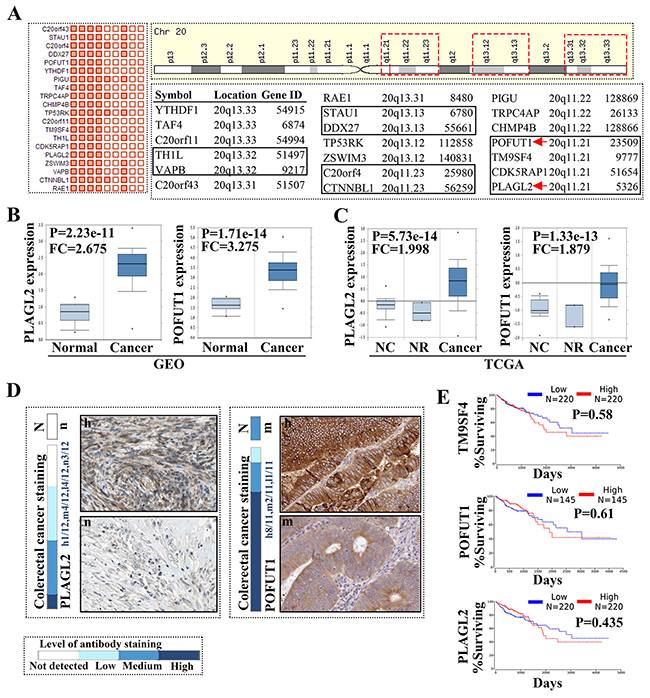 Figure 1: The genes located on chromosome 20q were frequently unregulated in colorectal cancer. (A) The top 20 genes with mRNA over expression in colon adenocarcinoma (COSMIC study Id: COSU376), the matrix on the left side of the figure list the top unregulated 20 genes in colon cancer (more details can be found in Supplementary Figure 1); the distribution of 20 genes on 20q and the symbol, location and gene ID of each gene were showed on the right side of the figure, red dashed box show all genes located in 3 DNA fragments, black rectangle was used to distinguish the genes located in 20q13.33, 20q13.32, 20q13.31, 20q13.13, 20q13.12, 20q11.23, 20q11.22, 20q11.21. (B/C) The representative gene (PLAGL2 and POFUT1) expression in colorectal cancer and normal tissues, which analyzed by Oncomine(GSE9348 and TCGA Colorectal), NC: normal colon, NR: normal rectum, FC: fold change. All other genes demonstrated same result as PLAGL2 (data not show, more detail can be found in Ocomine). (D) The representative protein expression derived from The Human Protein Atlas (PLAGL2 and POFUT1 with moderate to strong immunoreactivity was show here, data derived from antibody-based protein profiling using immunohistochemistry), N: normal tissue, n: negative, h: strong or high. (E) Survival analysis of PLAGL2, POFUT1 and TM9SF4 in colorectal cancer, data derived from TCGA.