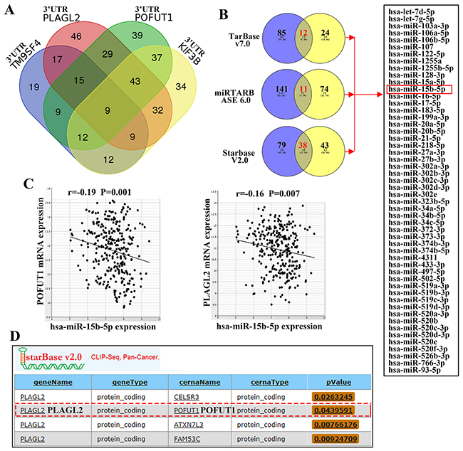 TargetScan 7.1, which has been proven to have with higher sensitivity and precision than other target predicting programs, was used to predict biological miRNA-mRNA intersection [42]. The experimentally validated microRNAs were compiled from TarBase v7.0 [43] and miRTARBASE 6.0 [44], the predicted miRNA-target interactions were processed from five miRNA prediction software programs (TargetScan, PicTar, PITA, miRanda and RNA22) and overlapped with CLIP-Seq data compiled from Starbase v2.0; In addition, Starbase v2.0 was employed to predict competing endogenous RNA (ceRNA) pairs by integrating the interactions from potential microRNA targets (miRanda/mirSVR) which overlapped with CLIP-Seq data [37], and to select the genes which can maintain correlation with POFUT1and PLAGL2 in 14 human tumor tissues.