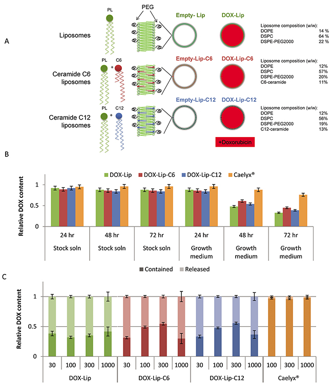 We have shown that ceramide species with different chain lengths (C6 or C12) induce increased sensitivity of cancer cells to DOX in a cell-specific manner. Furthermore, we have also demonstrated the importance of investigating cell toxicity at different time points and with different cell-based assays to assess the efficacy of drug formulations in vitro. Longer incubation times were required to obtain cell toxicity with Caelyx®, the golden standard liposomal marketed product widely used for cancer therapy, compared to our liposomal formulations. Furthermore, our data show that the in vitro toxicity analyses of nanocarriers do not necessarily reflect their ability to inhibit tumor growth in mice.