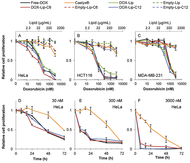 Figure 2: Dose-dependent effect of liposomal doxorubicin on cell proliferation. (A-C) Three different cell lines were incubated for 24 h with various concentrations of liposomal DOX (10-3000 nM) followed by measuring incorporation of [3H]thymidine. Free-DOX, empty liposomes with same lipid concentration or no treatment was used for comparison. A) HeLa, B) HCT116, C) MDA-MB-231. (D-F) Time-dependent effect of liposomal DOX on the cell proliferation. HeLa cells incubated with increasing liposomal DOX-concentrations (30, 300 and 3000 nM) or empty liposomes with same lipid concentration were incubated for up to 72 h and the cell proliferation was determined by measuring the incorporation of [3H]thymidine (Free-DOX used for comparison) at various time points (8 - 16 - 24 - 48 - 72 h). D) HeLa 30 nM, E) HeLa 300 nM, F) HeLa 3000 nM. The data show the mean values from at least three independent experiments and standard deviations. The total lipid concentration of the formulations is displayed on the secondary x-axis in A-C.