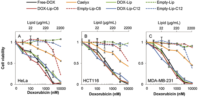 Figure 3: Dose-dependent effect of liposomal doxorubicin on cell viability. Cells were incubated for 72 h with various concentrations of DOX-containing (30 - 3000 nM DOX) liposomes and compared to Free-DOX and empty liposomes with the same lipid concentration. Cell viability was determined by using the MTT assay. (A) HeLa, (B) HCT116, (C) MDA-MB-231. The data show the mean values from at least three independent experiments and standard deviations. The total lipid concentration of the formulations is displayed on the secondary x-axis.