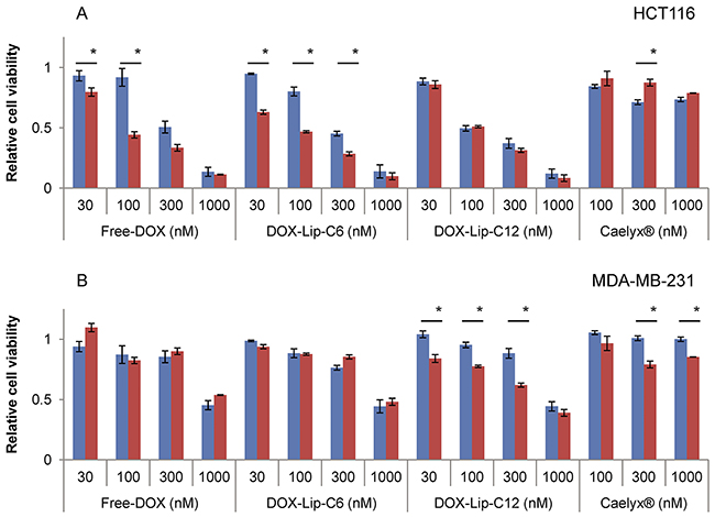 Figure 4: Dose-dependent effect of increased ceramide addition to liposomal doxorubicin on cell viability. (A) HCT116, (B) MDA-MB-231. Cells were incubated with various concentrations (30 nM - 1000 nM) of DOX-containing liposomes for 72 h. One part of the samples had an additional 1 μM of ceramide of same type of ceramide-liposomes without DOX added. Empty-Lip-C6 were added to DOX-Lip-C6 and Free-DOX, and Empty-Lip-C12 were added to DOX-Lip-C12 and Caelyx® and incubated for 72 h. The comparison was made between no addition (blue bars) and additional ceramide-containing liposomes (red bars). The cells’ viability was determined by using the MTT assay. The data show the mean values from three independent experiments and standard deviations. *p<0.05.