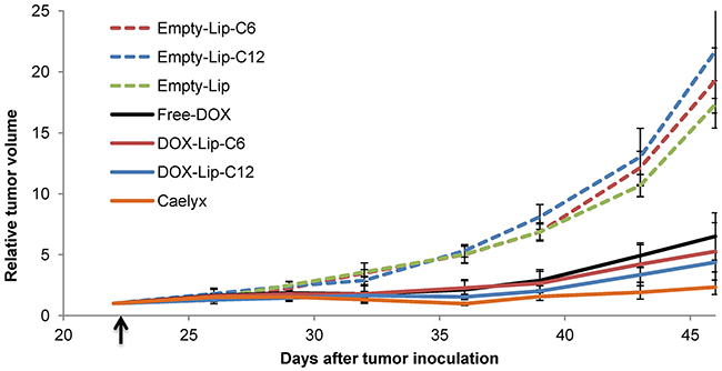 Figure 7: Effect of ceramide liposomes on tumor growth in mice bearing MAS98. 12 breast cancer xenografts. The tumor volumes were measured from day 22, i.e. one day prior to injection day (arrow mark) and up to day 47, i.e. 24 days after intravenous injection of DOX-containing liposomes or Free-DOX (8 mg/kg DOX) or a similar amount of empty liposomes. Tumor volumes are shown as relative to the tumor volumes at start of treatment. Data show mean values and standard deviations (n = 7-11 tumors).