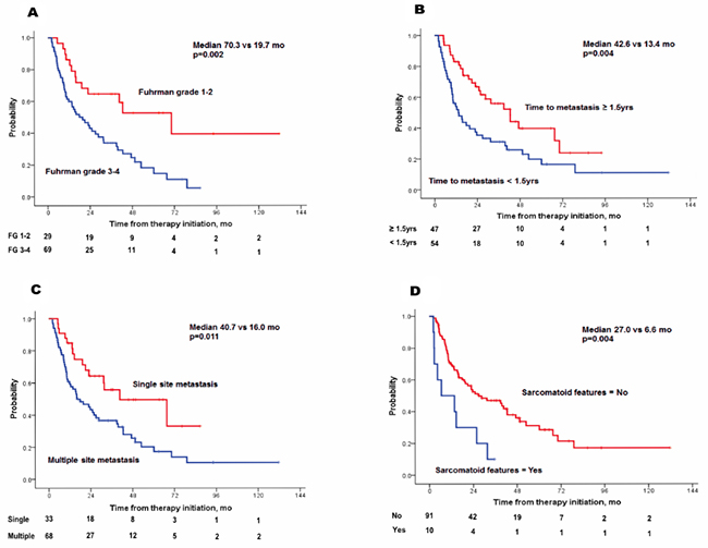We aimed to clarify the prognostic factors associated with metachronous mRCC in an attempt to prolong survival outcomes. Our study demonstrates interesting results regarding TTF and OS. Once the initial tumor was removed and residual tumor was absent, initial tumor size and T stage did not affect the prognosis in metachronous mRCC. Two prior studies have shown that size does not affect the prognosis of metachronous mRCC in small renal masses <4 cm [3, 18]. Nonetheless, size was a significant variable in the CORONA/SATURN-Project; however, the study primarily included patients treated with immune-based therapies from 1992–2010 [19]. As well, the CORONA/SATURN-Project results suggest that initial T stage is a significant factor for OS [19]. It has been established that higher T stage demonstrates worse OS in synchronous mRCC [20]. In the current study, sarcomatoid features demonstrated the highest HR in metachronous mRCC and affected both TTF and OS, which was in accord with previous studies [21]. Further, Fuhrman grade, a well-known prognostic factor for both TTF and OS in synchronous mRCC [22], independently affected TTF and exhibited borderline significance (p=0.054) with regards to OS. We additionally applied WHO/ISUP grading system and WHO/ISUP grade also significantly affected TTF (p=0.013), while having borderline significance at OS (p=0.065). Finally, the first metastasis site was not clinically relevant, but the number of metastatic sites was a significant factor.