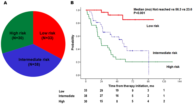 Predictive factors for TTF were analyzed by Cox regression (Table 2). Sarcomatoid features [hazard ratio (HR), 4.208; p=0.001], higher Fuhrman grade (3–4; HR, 2.435; p=0.013), single metastatic site (HR, 0.455; p=0.030), and time to metastasis < 1.5 years (HR, 2.267; p=0.006) showed a significant impact on TTF (Table 2 and Figure 1) following the multivariate analyses. Using four independent factors, three risk groups were generated: low (risk factor=0; N=16, 16.3%), intermediate (risk factor=1; N=40, 40.8%) and high-risk (risk factor ≥2; N=42, 42.9%). A survival graph of each risk group was generated (Figure 2), which indicated significantly different TTF in the three risk groups (median TTF for low, intermediate, and high-risk groups: 67.6 vs 31.7 vs 12.5 months, respectively; p=0.002)