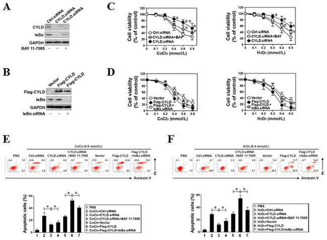 To interrogate the biological roles of CYLD on OS-initiated cell apoptosis, we treated CYLD siRNA- and Flag-CYLD-expressed PC12 cells with OS mimetic agents CoCl2 and H2O2 of different concentrations (from 0 to 0.8 mmol/L for CoCl2 and from 0 to 0.5 mmol/L for H2O2), respectively. Data from cell viability curves with MTT assay showed that either CoCl2 or H2O2 treatment decreased survival of PC12 cells in a dose-dependent manner, and this obviously occurred beyond concentration of 0.6 mmol/L CoCl2 and 0.4 mmol/L H2O2 (Figure 1C, 1D). Upon CoCl2 or H2O2treatment, the surviving proportion of cells bearing CYLD siRNA was much higher than that of cells bearing control siRNA. The cells bearing CYLD siRNA still had elevated survival proportion but to a lesser extent in the presence of BAY 11-7085 (*p<0.05, Figure 1C), indicating that NF-κB activation contributes to the CYLD deficiency-mediated apoptosis resistance against OS. Conversely, cells harboring wild-type CYLD were more sensitive to the CoCl2- or H2O2-induced apoptosis than the cells harboring vector, whereas these phenotypes were ameliorated after depleting IκBα with IκBα siRNA (*p<0.05, Figure 1D). The requirement for NF-κB for the resistant role of CYLD deficiency in OS-initiated cell apoptosis was further corroborated by the lactate dehydrogenase (LDH) release assay and flow cytometry analyses with Annexin V/PI staining, which showed that BAY 11-7085 restored the amount of LDH release (*p<0.05) and the percentage of apoptotic cells (*p<0.05) decreased by CYLD siRNA, whereas IκBα siRNA attenuated the amount of LDH release (*p<0.05) and the number of apoptotic cells (*p<0.05) increased by Flag-CYLD, upon either CoCl2 (Supplementary Figure 1C and Figure 1E) or H2O2 (Supplementary Figure 1D and Figure 1F) treatment, respectively. These data together suggest that CYLD confers OS-initiated apoptosis through inhibition of NF-κB transactivation.