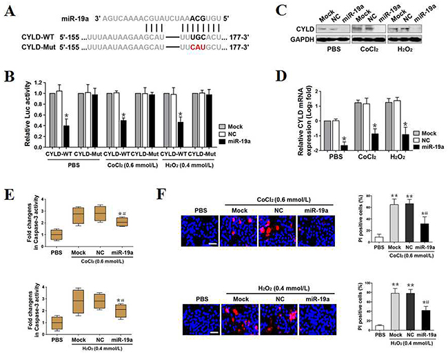 Figure 2: MiR-19a directly targets CYLD and antagonizes OS-initiated apoptosis. (A) Predicted miR-19a target sequence in wild-type CYLD-3′UTR (CYLD-WT) and mutant CYLD-3′UTR containing mutated nucleotides in the miR-19a seed-pairing region (CYLD-Mut). (B) Luciferase assays of CYLD-3′UTR activity in PC12 cells cotransfected with WT or Mut CYLD-3′UTR reporter constructs and mock (Mock), negative control (NC) as well as miR-19a mimics (miR-19a) in the presence of PBS, 0.6 mmol/L CoCl2 or 0.4 mmol/L H2O2 treatment, respectively. Experiments were performed three times and data are expressed as mean ± s.d. *p < 0.05 versus Mock and NC, one-way ANOVA, post hoc comparisons, Tukey’s test. (C) Western-blotting examining abundance of CYLD protein expression in PC12 cells transfected with mock (Mock), negative control (NC) and miR-19a mimics (miR-19a) in the presence of PBS, 0.6 mmol/L CoCl2 or 0.4 mmol/L H2O2 treatment, respectively. GAPDH was used as internal control of cytoplasmic extractions. (D) RT-qPCR analysing levels of CYLD mRNA expression in PC12 cells transfected with mock (Mock), negative control (NC) and miR-19a mimics (miR-19a) in the presence of PBS, 0.6 mmol/L CoCl2 or 0.4 mmol/L H2O2 treatment, respectively. Experiments were performed five times, each with quantitative RT-PCR in technical duplicate and real-time values were normalized to glyceraldehyde 3-phosphate dehydrogenase (GAPDH). Data are expressed as mean ± s.d. *p < 0.05 versus Mock and NC, one-way ANOVA, post hoc comparisons, Tukey’s test. (E) Caspase-3 activity assays of PC12 cells exposed to 0.6 mmol/L CoCl2 (top panel) or 0.4 mmol/L H2O2 (bottom panel) with mock (Mock), negative control (NC) and miR-19a mimics (miR-19a) transfection, respectively. Experiments were performed three times and data are expressed as mean ± s.d. *p < 0.05 versus PBS; #p < 0.05 versus Mock and NC, one-way ANOVA, post hoc comparisons, Tukey’s test. (F) Representative pictures (left panel) and quantification (right panel) from Hoechst and PI double-staining assay of PC12 cells exposed to 0.6 mmol/L CoCl2 (top panel) or 0.4 mmol/L H2O2 (bottom panel) with mock (Mock), negative control (NC) and miR-19a mimics (miR-19a) transfection, respectively. Data are expressed as mean ± s.d. *p < 0.05, **p < 0.01 versus PBS; #p < 0.05 versus Mock and NC, one-way ANOVA, post hoc comparisons, Tukey’s test.