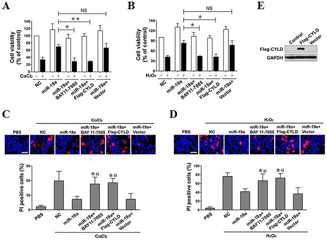 Figure 4: CYLD repression and NF-κB transactivation promotes the resistant phenotypes of miR-19a in OS-initiated apoptosis. (A) PC12 cells with miR-19a mimics transfection, with miR-19a mimics transfection plus 5 μmol/L BAY 11-7085 pretreatment, with miR-19a mimics plus Flag-tagged wild-type CYLD cotransfection and with miR-19a mimics plus empty vector cotransfection were separately treated with or without 0.6 mmol/L CoCl2 for 24h and the cell viabilities were measured by MTT assay. Experiments were performed three times and data are expressed as mean ± s.d. *p < 0.05, **p < 0.01. NS, not significant, one-way ANOVA, post hoc comparisons, Tukey’s test. (B) PC12 cells with miR-19a mimics transfection, with miR-19a mimics transfection plus 5 μmol/L BAY 11-7085 pretreatment, with miR-19a mimics plus Flag-tagged wild-type CYLD cotransfection and with miR-19a mimics plus empty vector cotransfection were separately treated with or without 0.4 mmol/L H2O2 for 24h and the cell viabilities were measured by MTT assay. Experiments were performed three times and data are expressed as mean ± s.d. *p < 0.05. NS, not significant, one-way ANOVA, post hoc comparisons, Tukey’s test. (C) Representative pictures (top panel) and quantification (bottom panel) from Hoechst and PI double-staining assay of PC12 cells exposed to 0.6 mmol/L CoCl2 with miR-19a mimics transfection, with miR-19a mimics transfection plus 5 μmol/L BAY 11-7085 pretreatment, with miR-19a mimics plus Flag-tagged wild-type CYLD cotransfection and with miR-19a mimics plus empty vector cotransfection, respectively. Data are expressed as mean ± s.d. *p < 0.05 versus PBS; #p < 0.05 versus miR-19a, one-way ANOVA, post hoc comparisons, Tukey’s test. (D) Representative pictures (top panel) and quantification (bottom panel) from Hoechst and PI double-staining assay of PC12 cells exposed to 0.4 mmol/L H2O2 with miR-19a mimics transfection, with miR-19a mimics transfection plus 5 μmol/L BAY 11-7085 pretreatment, with miR-19a mimics plus Flag-tagged wild-type CYLD cotransfection and with miR-19a mimics plus empty vector cotransfection, respectively. Data are expressed as mean ± s.d. *p < 0.05 versus PBS; #p < 0.05 versus miR-19a, one-way ANOVA, post hoc comparisons, Tukey’s test. (E) Western-blotting assessing abundance of Flag-CYLD protein expression in PC12 cells transfected with Flag-tagged wild-type CYLD and empty vector, respectively.