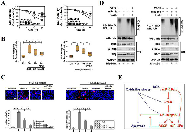 Figure 6: MiR-19a functions as a potential therapeutic target for cell survival under OS. (A) PC12 cells with miR-19a mimics transfection were treated with 0.6 mmol/L CoCl2 (left panel) or 0.4 mmol/L H2O2 (right panel) for the indicated times in the presence or absence of 100 ng/mL VEGF pretreatment and the cell viabilities were measured by MTT assay. Experiments were performed three times and data are expressed as mean ± s.d. **p < 0.01 versus control; #p < 0.05 versus miR-19a, one-way ANOVA, post hoc comparisons, Tukey’s test. (B) Caspase-3 activity assays of miR-19a-expressed PC12 cells treated with CoCl2 (left panel) or 0.4 mmol/L H2O2 (right panel) for 24h in the presence or absence of 100 ng/mL VEGF pretreatment. Experiments were performed three times and data are expressed as mean ± s.d. *p < 0.05, one-way ANOVA, post hoc comparisons, Tukey’s test. (C) Representative pictures (top panel) and quantification (bottom panel) from Hoechst and PI double-staining assay of miR-19a-expressed PC12 cells treated with CoCl2 (left panel) or 0.4 mmol/L H2O2(right panel) for 24h in the presence or absence of 100 ng/mL VEGF pretreatment. Data are expressed as mean ± s.d. *p < 0.05; **p < 0.01; ***p < 0.001, one-way ANOVA, post hoc comparisons, Tukey’s test. (D) Cellular ubiquitination assays comparing the poly-Ub levels of IκBα in miR-19a-expressed PC12 cells treated with CoCl2 (left panel) or 0.4 mmol/L H2O2 (right panel) in the presence or absence of 100 ng/mL VEGF pretreatment. (E) Proposed schematic illustrating a pivotal role for miR-19a in promoting cell survival under OS by CYLD repression-mediated and NF-κB transactivation-dependent regulatory feedback loop.