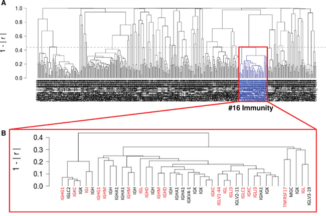 Figure 1: Unsupervised gene expression analysis of 2158 tumor samples containing 163 different tumor entities (GSE14520; NCBI-GEO). (A) A co-regulated 42 gene-containing cluster (#16) was identified (CC: 0.56-0.96) that was related with immunity and immunological events. (B) Most genes of this cluster coded for immunoglobulins or immunoglobulin fragments.