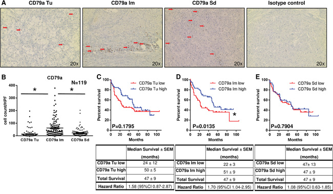 Figure 5: Localized infiltration of CD79a+ cells within the infiltrative margin is associated with increased patient survival. (A) Representative immunohistochemical stainings for CD79a+ cells (brown) separately for tumor (Tu), infiltrative margin (Im), distant, normal liver stroma (Sd) and isotype control (red arrows indicate positive cells). (B) Most CD79a+ cells were localized in the Im region around the tumor (62 ± 7 cells/HPF) which was significantly more than in the Tu (13 ± 3 cells/HPF; P<0.0001) and in the Sd area (23 ± 3 cells/HPF; P<0.0001). (C) Patients with high CD79a+ cell numbers in the Tu showed a trend to better survival than patients with low CD79a+ cell infiltration (P=0.1795). (D) Increased patient survival was noted in patients with high CD79a+ cell numbers in the Im region compared to patients with low infiltration by CD79a+ cells (P=0.0135). (E) In the Sd area patients with low and high CD79a+ cell numbers showed no survival differences (P=0.7904).