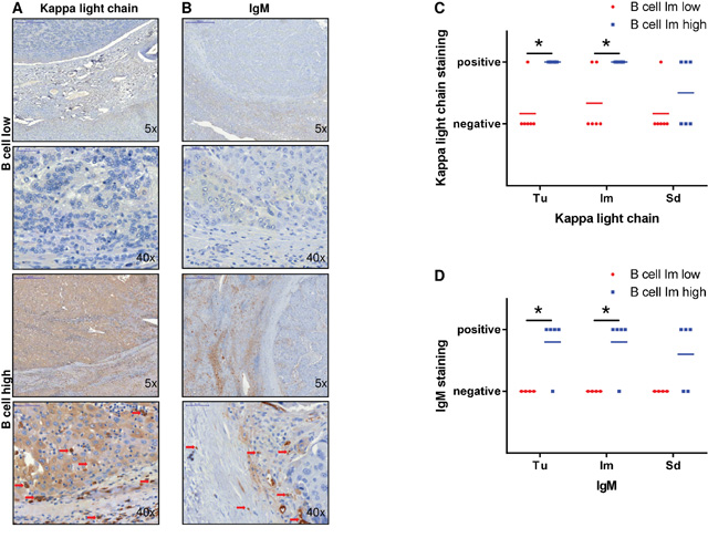 Figure 6: Expression of immunoglobulin fragments in tumor and infiltrative margin correlates with B-cell expression in patients after HCC resection. (A and B) Patient samples with high B-cell numbers showed strong positivity for Kappa light chain and IgM in Tu and Im areas in contrast to patients with low B-cell numbers where no expression of these immunoglobulin fragments was detected. (C) Kappa light chain expression of patients with high numbers of B cells in the infiltrative margin was significantly higher in Tu (P=0.0005) and Im area (P=0.0101) when compared to patients with low B-cell numbers without differences in the Sd region (P=0.2596). (D) IgM expression of patients with high numbers of B cells in the infiltrative margin was significantly higher in Tu (P=0.0096) and Im area (P=0.0096) when compared to patients with low B-cell numbers without differences in the Sd region (P=0.0676).