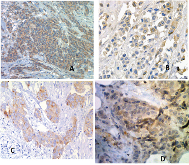 Figure 1: Immunohistochemistry of most significant factors associated with response to neo-adjuvant treatment. (A) EPO; (B) VEGF; (C) GLUT-1; (D) HIF-1? omit.