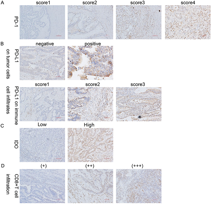 Figure 2: IHC staining for PD-1, PD-L1, CD8 and IDO expression. (A) Representative patterns of PD-1 expression from TILs with scores of 0, 1, 2 and 3 are shown. (B) Representative patterns of PD-L1 expression from negative and positive tumor cells are shown, as well as PD-L1 expression from immune cell infiltrates with scores of 1, 2 and 3. (C) Representative patterns of IDO expression from tumor cells with low and high expression are shown. (D) Representative patterns of CD8 expression from TILs with (+), (++) and (+++) expression are shown. Original magnification, ×100 (scale bars, 100 mm).