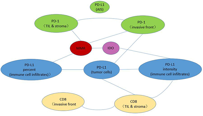 We also used the Mann-Whitney U test to analyze the correlations among the IHC scores of the immune checkpoint proteins. As is shown in Figure 5, MMR status was signicifantly corelated with PD-1 expression, PD-L1 expression on immune cell infiltrates and IDO expression (p<0.05). PD-L1 expression on tumor cells was signicifantly corelated with PD-L1 expression on immune cell infiltrates and PD-1 expression in invasive front compartment (p<0.05).