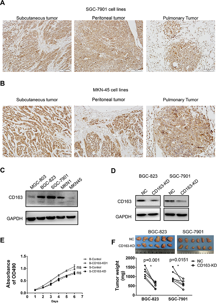 Figure 7: The expression and function of CD163 in gastric cancer cells. CD163 expression in different tissues xenografts (subcutaneous, peritoneal and pulmonary cancer) from SGC-7901 (A) and MKN-45 (B) transplanted nude mice are examined by immunohistochemistry assay (200×). The expression of CD163 in 5 gastric cancer cell lines (C) and CD163 knocking-down stable cell lines (D) are detected by Western blot. The effect of CD163 on cell growth in vitro and in in vivo are evaluated by MTT (E) and tumor-bearing nude mice respectively (F). ns, no significant difference; “B” and “S” in panel E represent “BGC-823” and “SGC-7901” respectively.