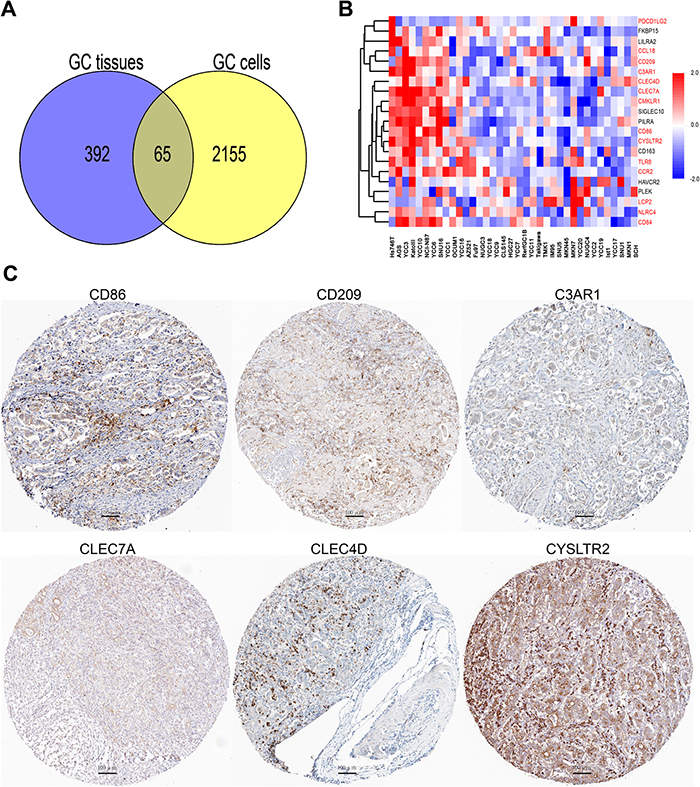 As mentioned above that stroma cells in cancer tissues may interfere the results of CD163 in cancer cells. In an effort to examine the potential function of CD163 in gastric cancer cells, genes which were co-expressing with CD163 in 37 gastric cancer cell lines and 381 gastric cancer tissues were analyzed (correlation coefficient >3.5). Results showed there were 65 overlapped genes which had positive correlation with CD163 (Figure 8A). Then the top 20 overlapped genes in cancer cell lines were enriched and clustered with R software. As shown in Figure 8B, many immune related molecules such as CCL18, CD209, C3AR1, CLEC4D, CLEC7A, CMKLR1, CD86, CYSLTR2, TLR8 and CCR2 were consistent with CD163, suggesting CD163 expressed in cancer cells may also be involved in tumor immune evasion. Subsequently, we blasted these immune related proteins in Protein Atlas database (www.proteinatlas.org) [20], and found that proteins including CD86, CD209, C3AR1, CLEC4D, CLEC7A and CYSLTR2 have positive staining in cancers cells (Figure 8C). This finding was consistent with several other studies which had confirmed that genes such as CD209 [21], C3AR1 [22], CLEC7A [23] and CYSLTR2 [23] had differentially expression in cancer cells. We also evaluated the correlation between CD163 expression with two key immune checkpoints PD-L1 and CTLA4 in gastric cancer cell lines. As shown in Supplementary Figure 1E and 1F, both these two checkpoints were positively correlated with CD163, indicating CD163 might be a novel immunomodulatory protein.
