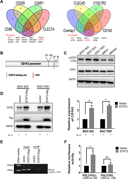 Figure 9: CD163 is a novel target gene of STAT3. (A), Overlapped transcriptional factors of CD86, CD209, C3AR1, CLEC7A, CLEC4D, CYSLTR2 and CD163 are identified by Venny software. (B), Potential STAT3 binding sites on the promoter of CD163 is predicted by JASPAR. (C), The expression of STAT3 and activated STAT3 (pY705 STAT3) in gastric cancer cell lines are detected with Western blot. (D), Relative expression of CD163 after overexpressing STAT3 is validated by Western blot assay. (E), STAT3- DNA complex in SGC-7901 is isolated by Chromatin immunoprecipitation, and potential binding region is identified by PCR. (F), The effect of STAT3 on promoter activity of full length type or deletion type is evaluated by luciferase reporter assay.
