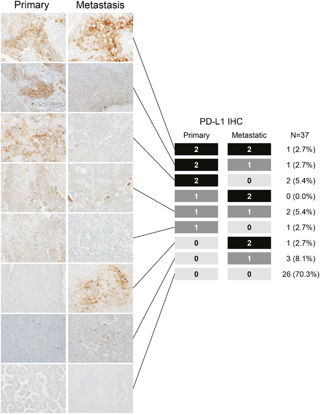 Figure 1: Programmed death-ligand 1 (PD-L1) expression levels in paired surgically resected primary and metastatic tissues with representative PD-L1 immunohistochemistry images. Most cases showed concordance of PD-L1 immunohistochemical (IHC) staining between primary and metastatic sites.