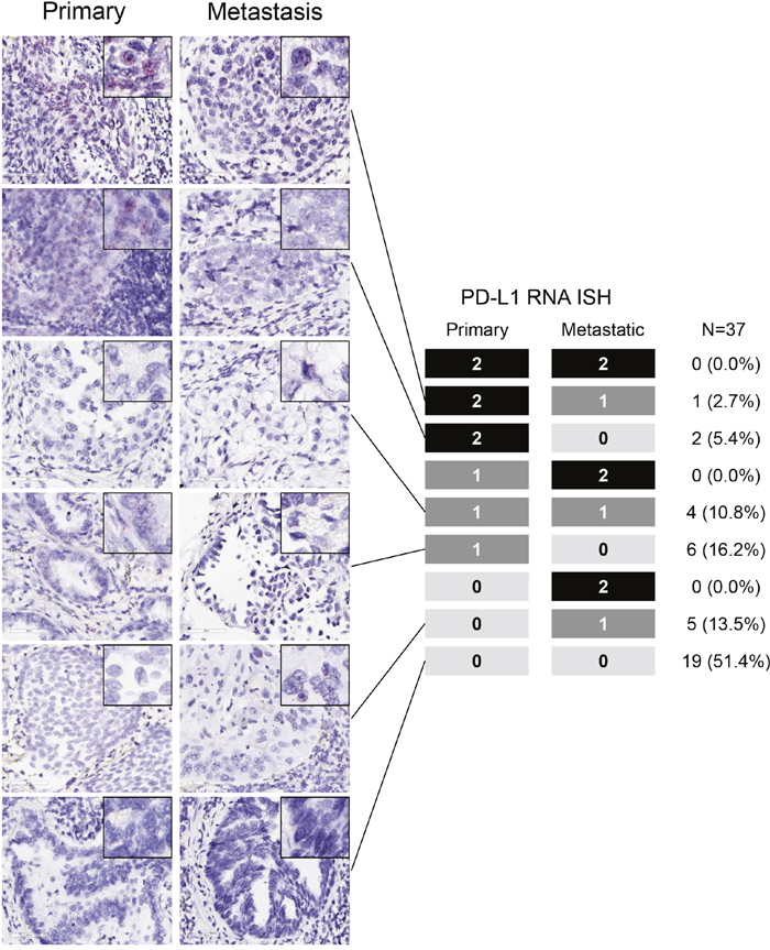 Figure 2: PD-L1 mRNA levels in paired surgically resected primary and metastatic tissues with representative PD-L1 RNA in situ hybridization (RISH) images. Most patients demonstrated concordance of PD-L1 RISH between primary and metastatic sites.