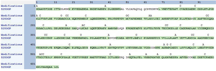 Figure 3: Sequence coverage and residue modification of Tα1-HSA detected by LC-MS/MS. A: acetyle; C:carbamidomethyl; O: oxidation.