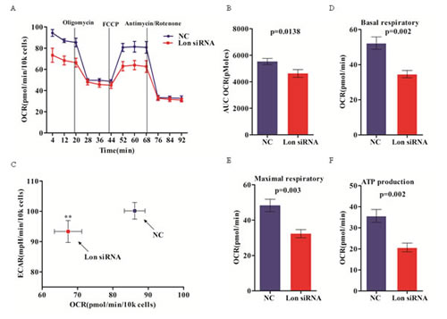 antimycin A-treated was contributed to capacity for ROS production and non-mitochondrial O2 consumption (Figure 5A). To further evaluate the difference of OCR variation between Lon siRNA and control cells, we assessed the mitochondrial function parameters by analyzing the OCR data at time point1-12, and we found markedly decrease of basal respiratory as well as ECAR at basal condition in Lon knockdown cells (p=0.002, Figure 5D), which indicated that Lon may play a crucial role in regulating cellular energy metabolism. Moreover, maximal respiratory and ATP production were also decreased due to Lon down-regulation (p=0.003 and p=0.002, Figure 5E and 5F), and which suggest that Lon may interact with the complexes of ETC to regulate the complexes activities given that the molecular chaperone properties of Lon protease. Further work need to be done to uncover the molecular mechanism of Lon regulating the bioenergetics of bladder cancer cell. Together, these data suggest that Lon may act as a vital modulator of cellular bioenergetics in bladder cancer cells.