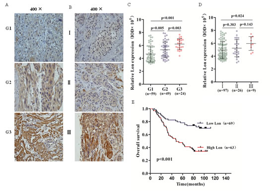 Figure 6: Immunohistochemical (IHC) staining of Lon protein in bladder cancer tissues and Kaplan–Meier overall survival curve of bladder cancer patients according to Lon expression. (A & B) Representative Lon IHC staining photomicrographs (400×) of Grade 1, Grade 2 and Grade 3 bladder cancer tissues (A) and TNM stage I, II and III bladder cancer tissues (B). (C &D) Quantitative IHC results of Lon expression in different tumor grade (C) and different TNM stage (D). (E) The Kaplan-Meier overall survival curve of bladder cancer patients (n=132) according to Lon protein expression (p<0.001).