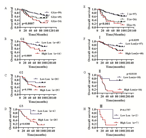 Figure 7:Kaplan–Meier overall survival analysis for bladder cancer patients in different grade and TNM stages carried out according to the expression status of Lon. (A) Significant prognostic effect of cell differentiation (Grade) for BC patients survival (p=0.0007). (B, C & D) The effect of Lon expression on the survival of bladder cancer patients in the group of G1 (p=0.0809, B), G2 (p=0.1906, C) and G3 (p=0.0388, D), respectively. (E) TNM stage significantly influences BC patients survival (p<0.001). (F, G & H) The effect of Lon expression on the survival of bladder cancer patients in the group of TNM stage I (p=0.0359, F), stage II (p=0.0110, G) and stage III (p=0.0157, H), respectively.