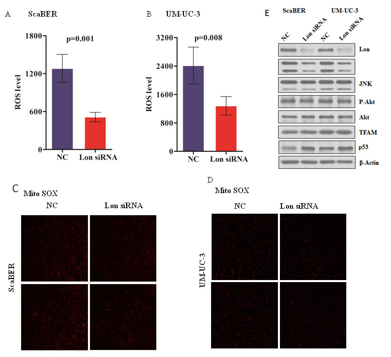 Figure 4: Down-regulation of Lon decreased mitochondrial ROS production as well as c-Jun N-terminal kinases (JNK) activation. (A & B) Intracellular ROS of control (NC) and Lon knockdown ScaBER (A) and UM-UC-3 (B) cells was measured by using the fluorescence probe DCFH-DA. (C & D) Mitochondrial ROS level in control (NC) and Lon knockdown ScaBER (C) and UM-UC-3 (D) cells was determined using MitoSOXTM Red regent. The images were taken with fluorescence microscope and representative images were shown. (E) Whole cell extracts were prepared form control (NC) and Lon knockdown ScaBER and UM-UC-3 cells. Equal amount of extracts (20 μg) were resolved on 10% SDS-PAGE and immunoblotted with indicated antibodies.