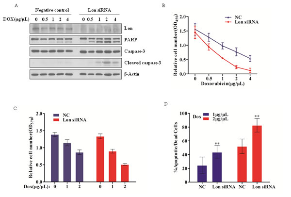 UM-UC-3 cells were transfected with Lon and negative control siRNA, and resuspended in DMEM medium 24 h post transfection. Cells were then seeded into 6-well plate at a density of 4×105 cells/well and incubated at 37 ºC, 5% CO2 for 24 h. Next, cells were treated with a concentration gradient of doxorubicin (0, 0.5, 1, 2, 4μg/μL).Then cells were collected and subjected to western blotting with indicated antibodies
