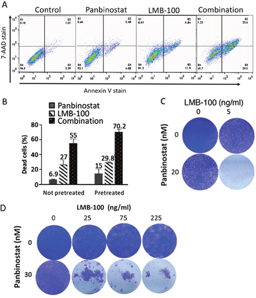 Figure 1: Pan combination enhanced with lMB-100 activity synergistically. KLM1 cells were treated with 20 nM of panbinostat, 10 ng/ml LMB-100 or both (Combination) and incubated for 3 days. The cells were all collected and stained with 7-AAD and Annexin-V. Typical staining profile were shown (A). (B) KLM1 cells were pretreated with 5 nM panbinostat for 6 hours (pretreated) or not pretreated, and then were treated with 20 nM panbinostst or LMB-100 5 ng/ml for 3 days. Dead cells include 7-AAD, Annexin V or both positive cells. The percentage of dead cells was calculated by subtracting the control dead cells. (C) and (D) KLM1 (C) or Panc3.014 cells (D) were treated as in (A). Dead cells were washed and fresh media were added to allow the live cells to recover. Cells were fixed and stained with crystal violet 4 days later.
