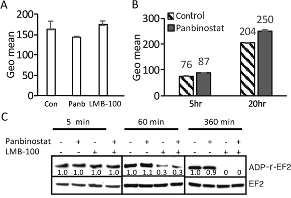 After internalization and furin cleavage, the active portion of the toxin is transferred to the endoplasmic reticulum and then to the cytosol, where it ADP-ribosylates EF2. To assess if ADP-ribosylation of EF2 was affected by panbinostat, we performed EF2-ribosylation assays (Figure 2C). Cell lysates from cells treated with LMB-100, panbinostat or both for various periods of time were prepared and SS1P and NAD-biotin were added to the extracts, which were then incubated for 1 hour to allow the added SS1P to catalyze the ADP-ribosylation of unmodified EF2. This assay measures how much EF2 remains unmodified by the toxin and therefore active after the cells were exposed to LMB-100. We found that the amount of EF2 available for ADP-ribosylation was not changed after cells were treated for 5 minutes. After 60 minutes the amount was decreased by 70% in both cells treated with LMB-100 alone or LMB-100 and panbinostat. After 6 hours of treatment, all the EF2 was modified and not available for modification in cell free extracts. These results show that panbinostat does not enhance the rate of modification of EF2 by the toxin and indicates panbinostat acts after the ADP-EF2-ribosylation step.