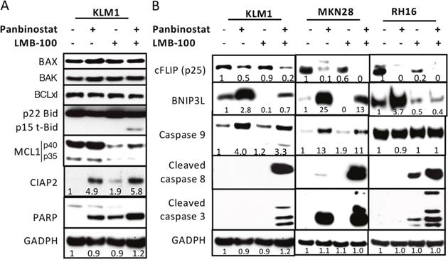 To study if the changes in apoptotic proteins observed in KLM1 cells occurred in other cell lines, we treated MKN28 and RH16 cells with panbinostat, LMB-100 or the combination. In MKN28 cells, panbinostat decreased cFLIP and increased BNIP3L and increased caspase-9 and the combination further decreased cFLIP and enhanced cleavage of caspase-8 and caspase-3. In RH16 cells, panbinostat lowered cFLIP and elevated BNIP3L, and the combination lowered cFLIP and BNIP3L and greatly enhanced cleavage of caspase-3 and caspase-8. Caspase-9 did not change in RH16 cells, in which the level in untreated cells is very high. Overall, the major changes in apoptotic proteins were similar in all three cancer cell lines.