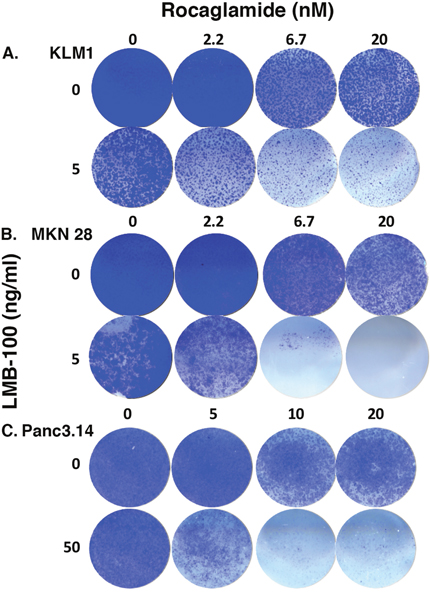 Figure 4: c-FLIP inhibitor increased LMB-100 cell killing. KLM1 (A), MKN28 (B) or Panc3.014 (C) cells were plated on 24 well plates. After overnight culture, the cells were treated with RocA at indicated concentration for 45 minutes, then LMB-100 added with or without the RocA for 3 days. The cells were then replenished with fresh media without drugs and grown for another 4 days. The surviving cells were stained with crystal violet and images were scanned.