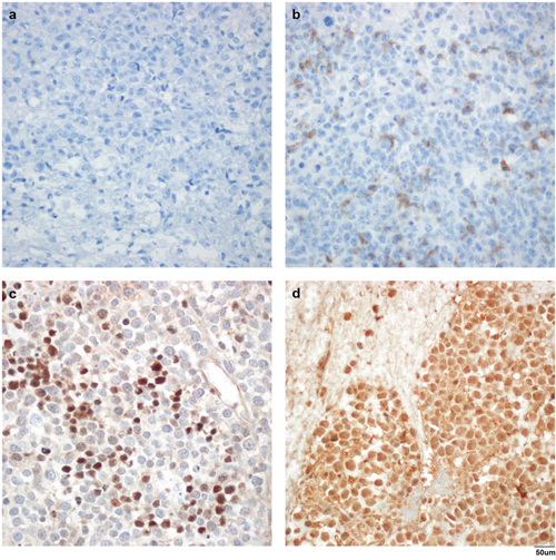 Figure 1: Representative immunohistochemical stains in formalin-fixed and paraffin-embedded samples. Negative control (a), high PD-1 expression (b), PD-L1 (c), and PD-L2 (d) with anti-PD-1 antibody (NAT105, a and b), anti-PD-L1 antibody (ab58810, c), and anti-PD-L2 antibody (MIH18, d). Magnification, ×400.