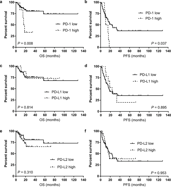 Patients with high expression of PD-1 showed significantly shorter 2-year OS and PFS of 33.3% and 0.0%, in comparison to 81.2% and 50.5% for those with low expression of PD-1 (P = 0.008 for OS; Figure 2a, and P = 0.037 for PFS; Figure 2b), respectively.