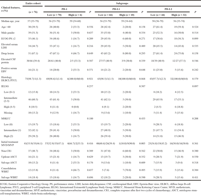 Importantly, PCNSL exhibited frequent 9p24.1/PD-L1/PD-L2 copy number alterations [9] and even PD-1 blockade demonstrated clinical activity in relapsed/refractory PCNSL [12], although only small number of patients were evaluated. Based on these findings, we sought to evaluate PD-1, PD-L1, and PD-L2 expressions in immunocompetent PCNSL patients at diagnosis, as well as their prognostic implication.