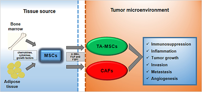 Figure 1: MSCs trans-differentiation into tumor microenvironment. MSCs deriving from bone marrow or from adipose tissue can be recruited to tumor microenvironment in response to multiple signals: chemokines, cytokines and growth factors. Here, MSCs can trans-differentiate into tumor-associated MSCs (TA-MSCs) and cancer-associated fibroblasts (CAFs). They are characterized by specific markers such as α-smooth muscle actin (α-SMA), fibroblast activating protein (FAP) and fibroblast-specific protein 1 (FSP1). TA-MSCs and CAFs promote metastatic phenotype acting on: immunosuppression, inflammation, tumor growth, invasion, metastasis and angiogenesis.
