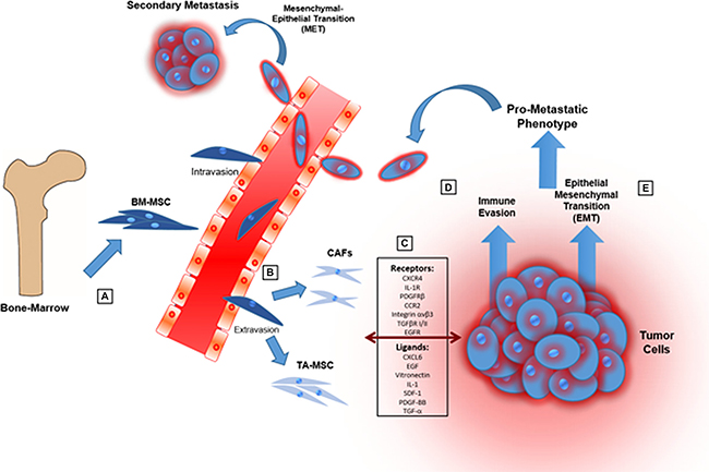 In these last decades, many researches focused on the possible role of mesenchymal stem cells (MSCs) to promote tumor progression by interacting with tumor cells and other stroma cells in the complex network of microenvironment [1]. The multiple properties of these cells such as self-renewal, plasticity to differentiate into several cell types and ability to modulate immune response as well as strong tropism to tumors make them crucial players in the development of metastatic phenotype.