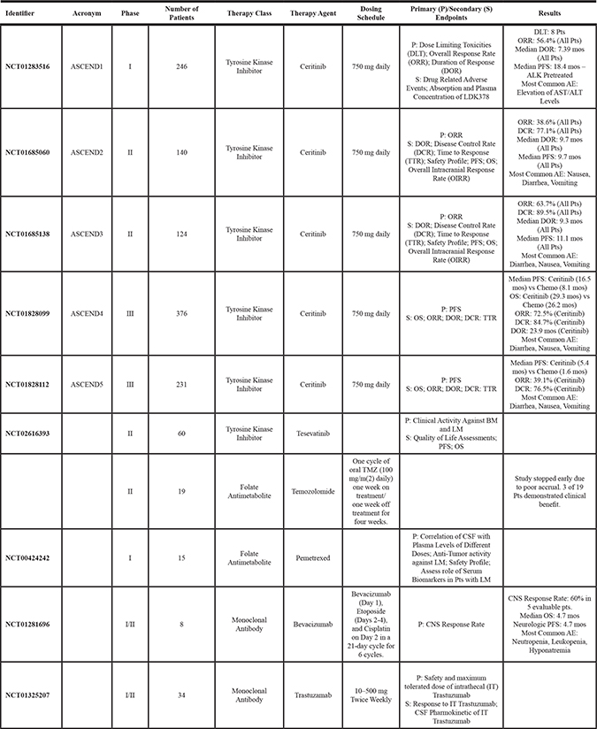 Ceritinib is currently being studied in multiple Phase II and III studies of LMD secondary to NSCLC with documented ALK rearrangement. Phase II trials include ASCEND-2, which treats crizotinib-resistent LMD, and ASCEND-3, which treats ALK-inhibitor naive LMD. Phase III trials include the ASCEND4 trial, where treatment is randomized to platinum pemetrexed versus ceritinib, and the ASCEND5 trial, where patients failing crizotinib are randomized to pemetrexed, docetaxel, or ceretinib [131]. To date, the ASCEND-2 and ASCEND-3 trial showed improved whole-body overall response rate (ASCEND-2: 38.6%, ASCEND-3: 58.9%) and progression free survival (ASCEND-2: 5.7 months, ASCEND-3: 11.1 months).