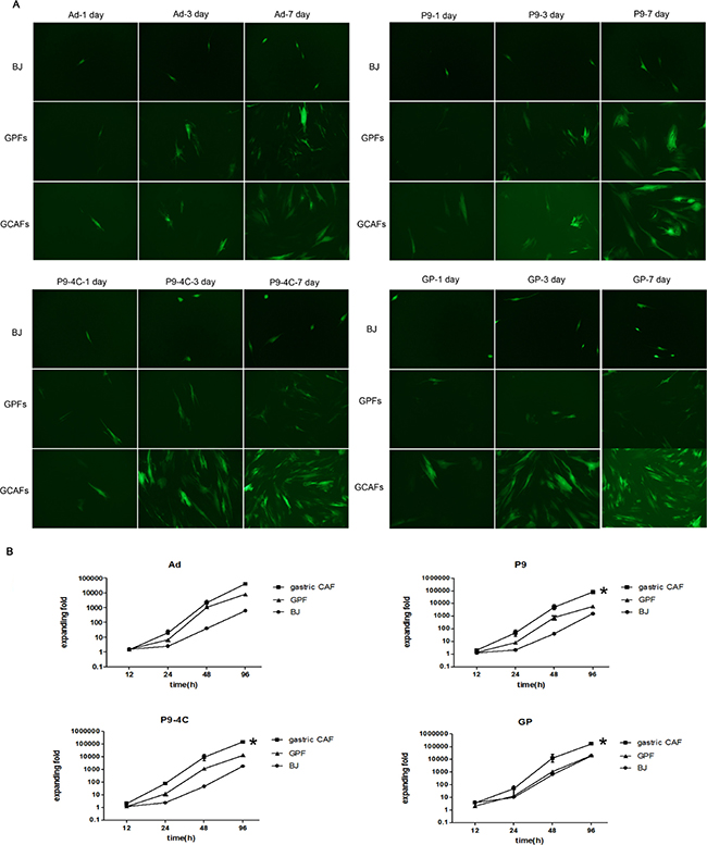 Figure 2: Comparison for the reproductions of four hexon-chimeric oncolytic adenovirus (P9, P9-4C, GP and Ad) in BJ cells, GPFs and gastric CAFs. (A) The fluorescent images of the EGFP expression at 1, 3 and 7 days after the infection (MOI = 5). (B) The reproduction fold changes at 0, 12, 24, 48 and 96 h after the infection (MOI = 5). *, VS. GPFs, p < 0.05.