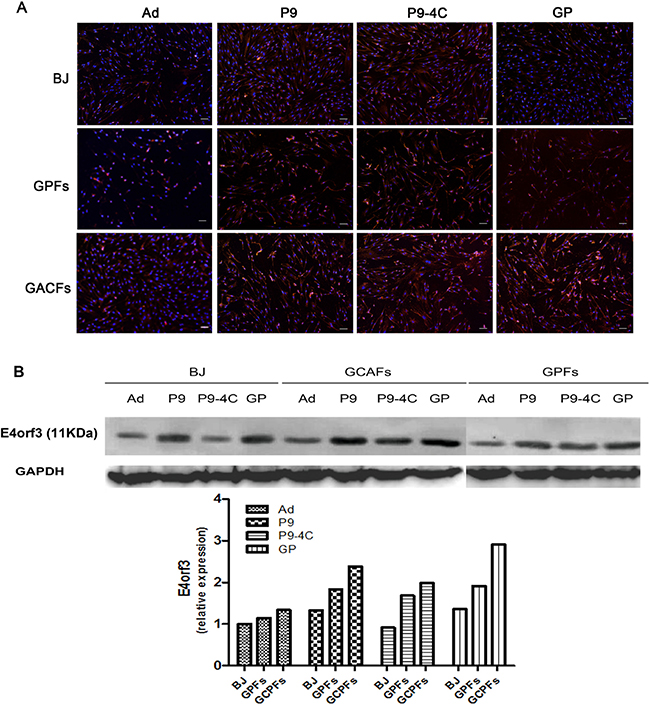 Figure 3: Comparison for the infectivities of four corresponding replication-defective adenovirus (P9/RFP, P9-4C/RFP, GP/RFP and Ad/RFP) in BJ cells, GPFs and gastric CAFs at 48 h after infection (MOI = 100). (A) The RFP expression by fluorescent images. (B) The expression of E4orf3 protein (11KDa) by western blotting.