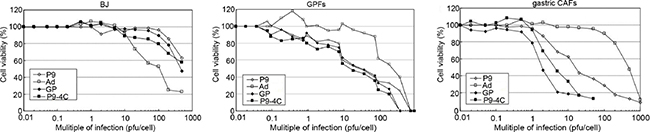 Figure 4: Comparison for the killing abilities of four hexon-chimeric oncolytic adenovirus (P9, P9-4C, GP and Ad) in gastric CAFs, GPFs and BJ dependently on a series of MOI (0-500). The three fiber-modified hexon-chimeric oncolytic adenovirus (P9, P9-4C and GP) effectively inhibited the viability of gastric CAFs cells than GPFs and BJ cells at MOI = 1 initially and at MOI = 10 markedly, and without obviously effect on BJ cells at less than or equal to MOI = 10.