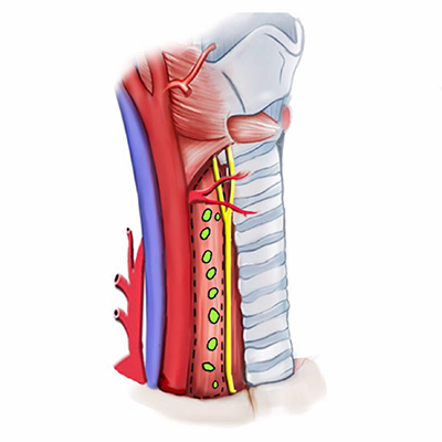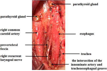 The right cervical central VI-2 subzone (LN-prRLN) dissection of lymph nodes removed all lymphatic and adipose tissue posterior to the right RLN, in which superior boundary was the laryngeal entry point of the right RLN. The inferior boundary was the intersection of the innominate artery and the tracheoesophageal groove (near the right apical pleura). The inner boundary was the edge of the esophagus; and the external boundary was the inner edge of the common carotid artery. The deepest layer of this dissection reached the deep cervical fascia (prevertebral fascia), and the superficial layer was on the plane of the right RLN (Figures 1 and 2).