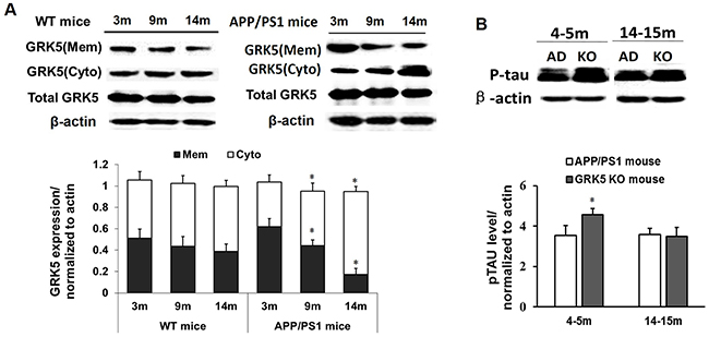 Figure 1: GRK5 translocation from the membrane to the cytosol in the hippocampus of aged APP/PS1 transgenic mice. (A) Western blotting analysis of GRK5 expression in hippocampal membrane and cytosolic fractions from 3, 9 and 14-month-old APP/PS1 transgenic mice and WT mice. *p<0.05, compared with 3-month-old APP/PS1 transgenic mice. (B) Western blotting analysis of p-tau levels in the hippocampus of APP/PS1 transgenic mice and GRK5KO mice at 4-5 months or 14-15 months of age. *p<0.05, compared with APP/PS1 transgenic mice.