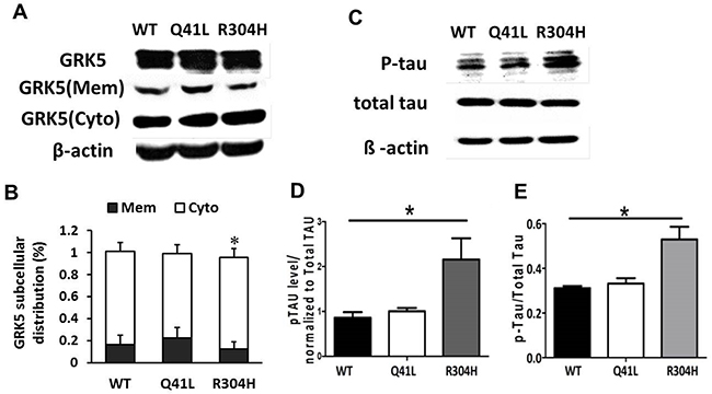 Figure 3: Influence of GRK5-Gln41Leu and Arg304His on GRK5 translocation and tau hyperphosphorylation. (A) Western blotting analysis of GRK5 levels in GRK5 mutant cells and control cells. (B) Quantitative analysis of GRK5 expression in GRK5 mutant cells and control cells. (C) Western blotting analysis of p-tau expression in GRK5 mutant cells and control cells. (D) Quantitative analysis of GRK5 mutant cells and control cells on p-tau expression. *p<0.05, compared with WT. (E) ELISA analysis of p-tau level in GRK5 mutant cells and control cells. *p<0.05, compared with WT.